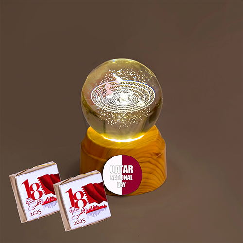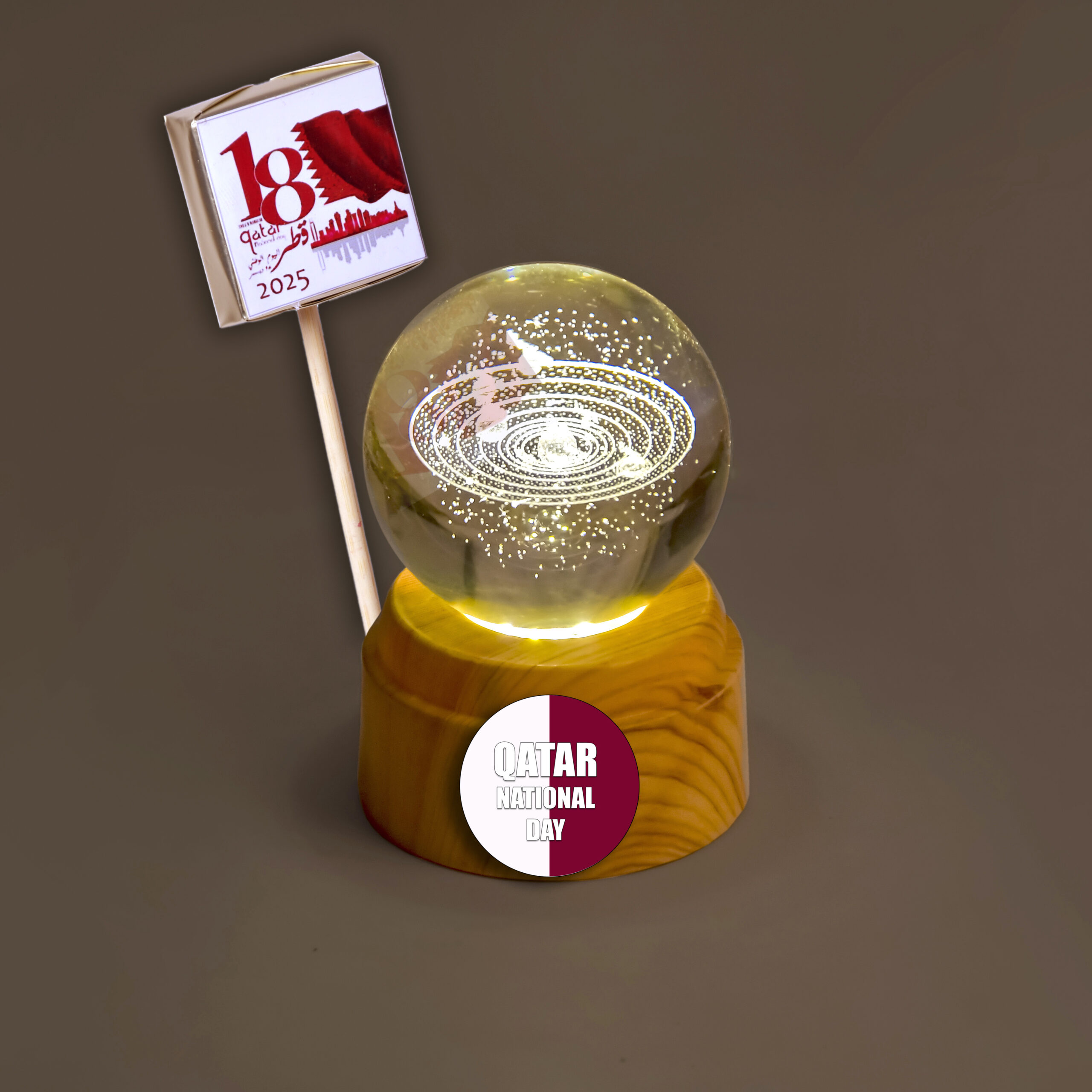 it shows a decorative glass sphere sitting on a wooden base. Inside the glass sphere, there is a glowing pattern that looks like a swirling galaxy made of tiny illuminated dots. The light inside gives the sphere a warm, magical appearance. Attached to the wooden base is a round badge with the colors of the Qatar flag (maroon and white). The badge has the text “Qatar National Day” written on it