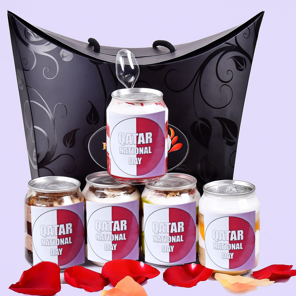 Five jars, one proud nation. Our Qatar National Day gift set features rich layered desserts, rose petals, and elegant packaging—perfect for heartfelt gifting and festive gatherings