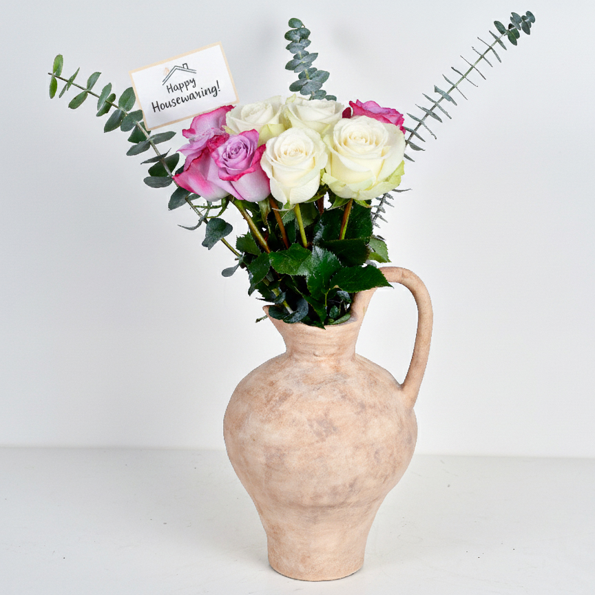 Welcome warmth and charm into any new home with this graceful bouquet of pink and white roses, nestled in a rustic ceramic pitcher and accented with fresh eucalyptus. A timeless gift that blends countryside elegance with heartfelt celebration—complete with a cheerful housewarming card to mark the occasion.