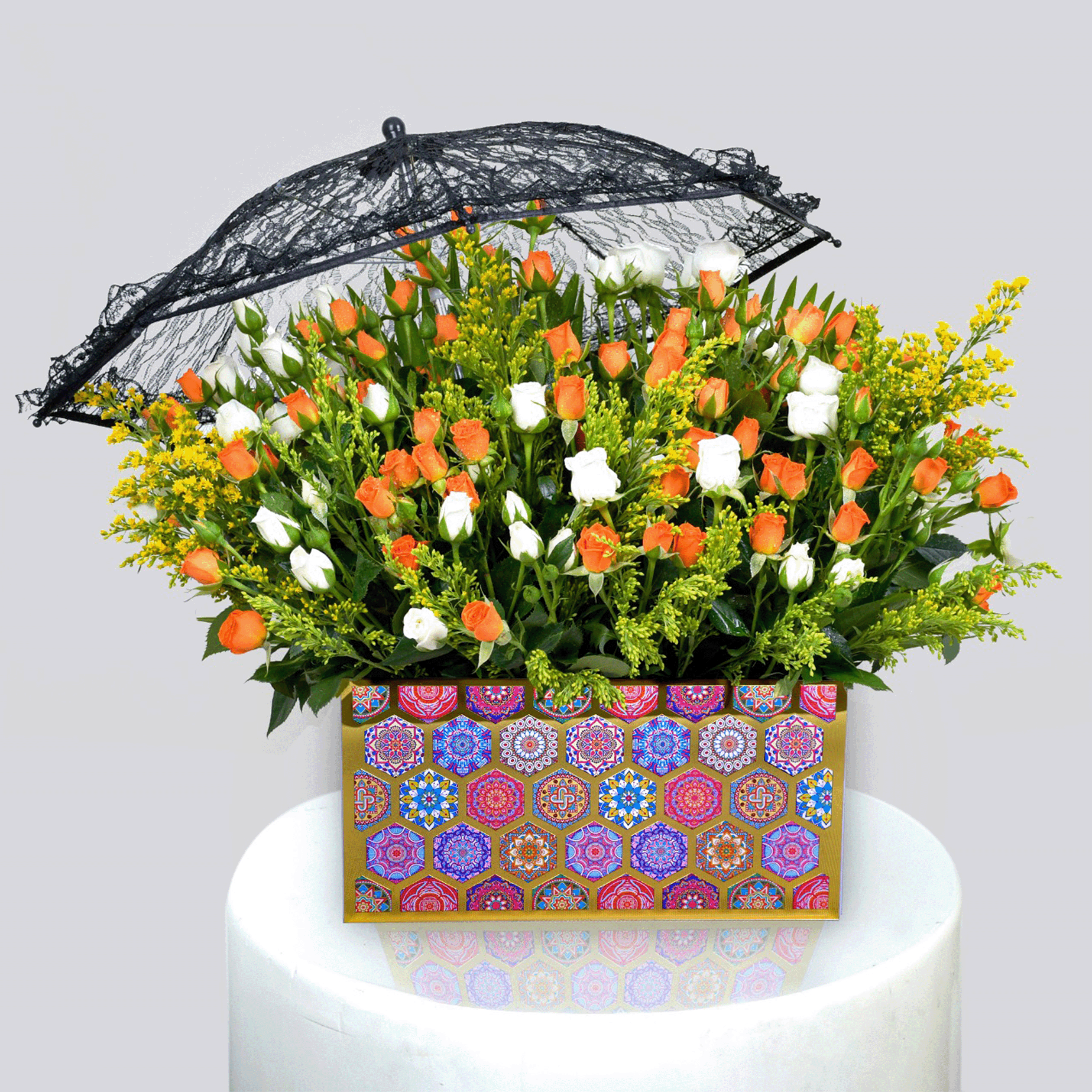 A joyful burst of orange and white roses paired with sunny yellow fillers, all nestled in a vibrant geometric box and crowned with a delicate black lace umbrella. This playful yet elegant arrangement is a showstopper—ideal for festive occasions, grand gestures, or simply making someone smile.