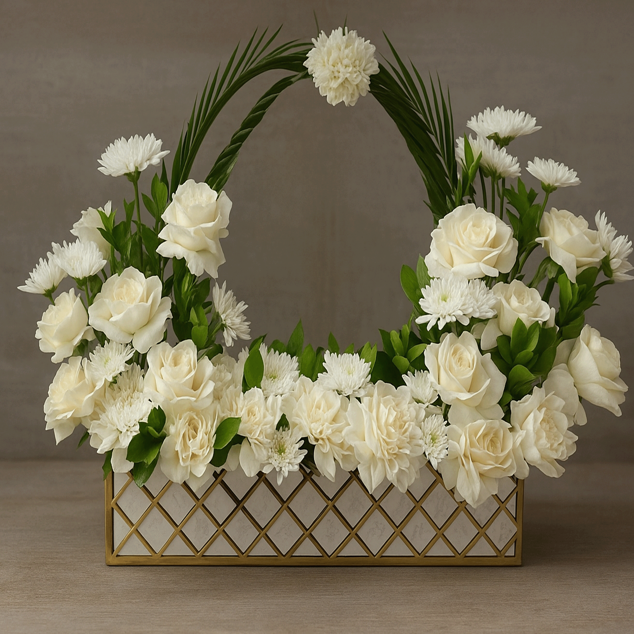 A radiant display of yellow roses and lush greenery, beautifully arranged in a vibrant geometric box and topped with a delicate white lace parasol. This sunny bouquet brings warmth, joy, and a touch of whimsy—perfect for celebrating new beginnings or brightening any space.