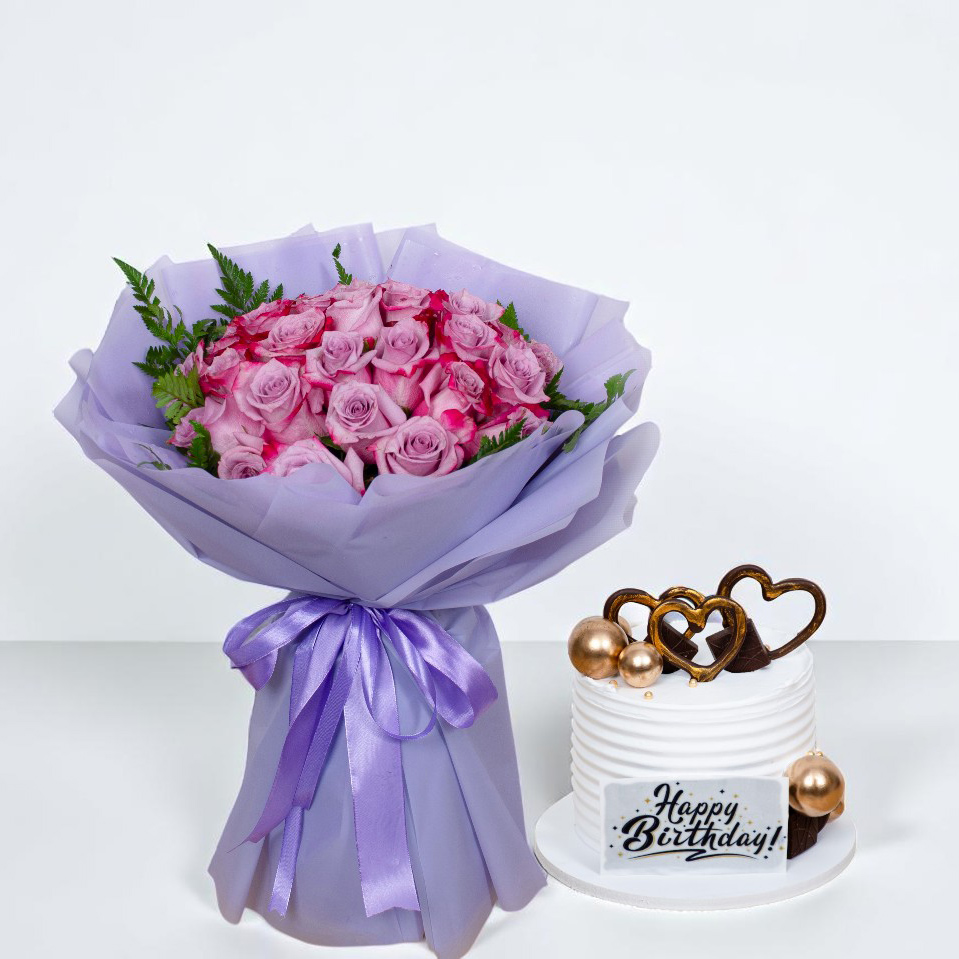 A graceful bouquet of pink roses wrapped in soft lavender, paired with a celebratory cake. Blush Bloom is perfect for birthdays, sweet surprises, and moments that call for tenderness and charm.