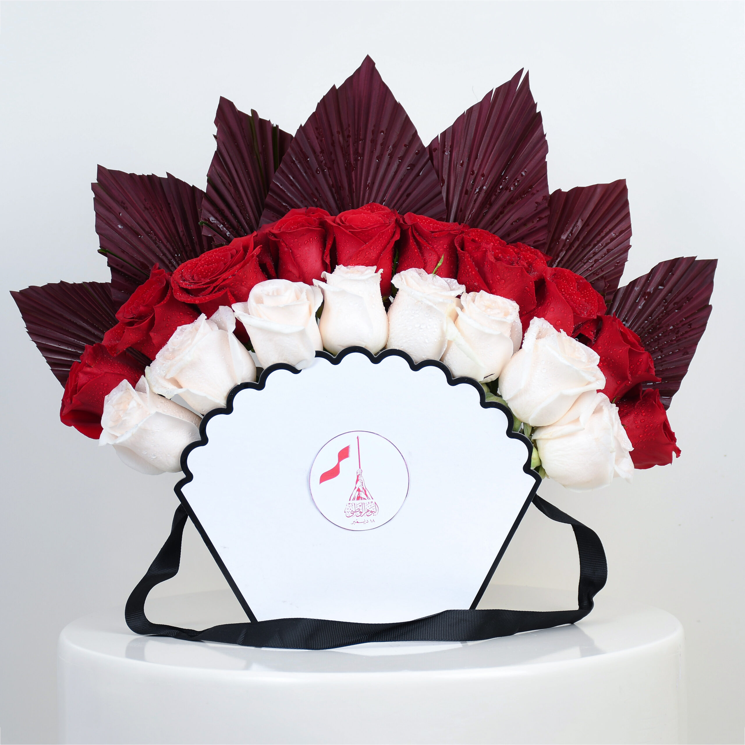 A regal display of roses and palms, arranged with reverence and rhythm. The scalloped edge frames tradition, the ribbon binds unity, and every petal sings of Qatar’s sovereign beauty.