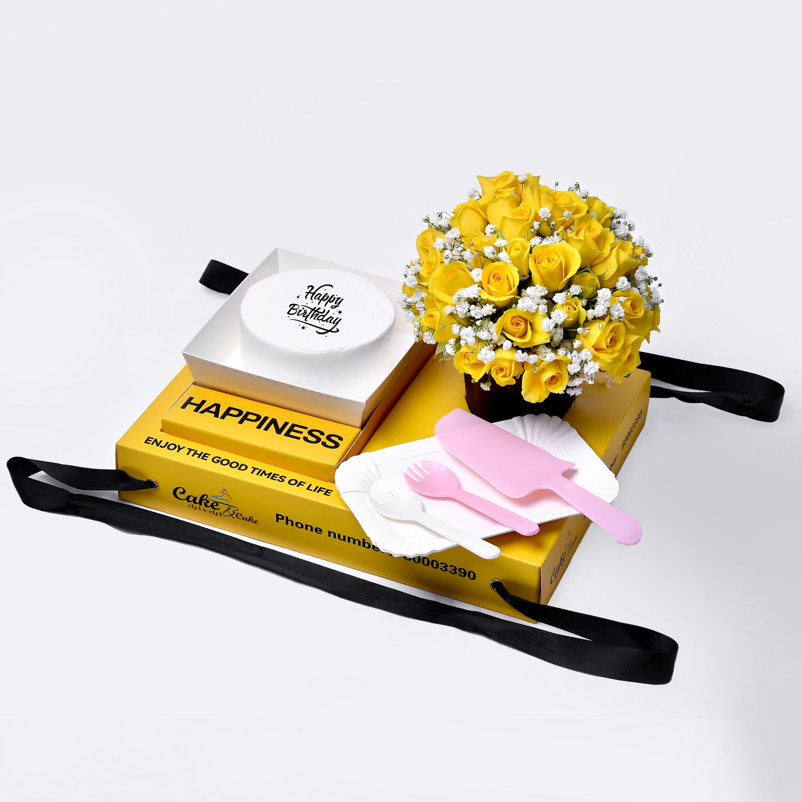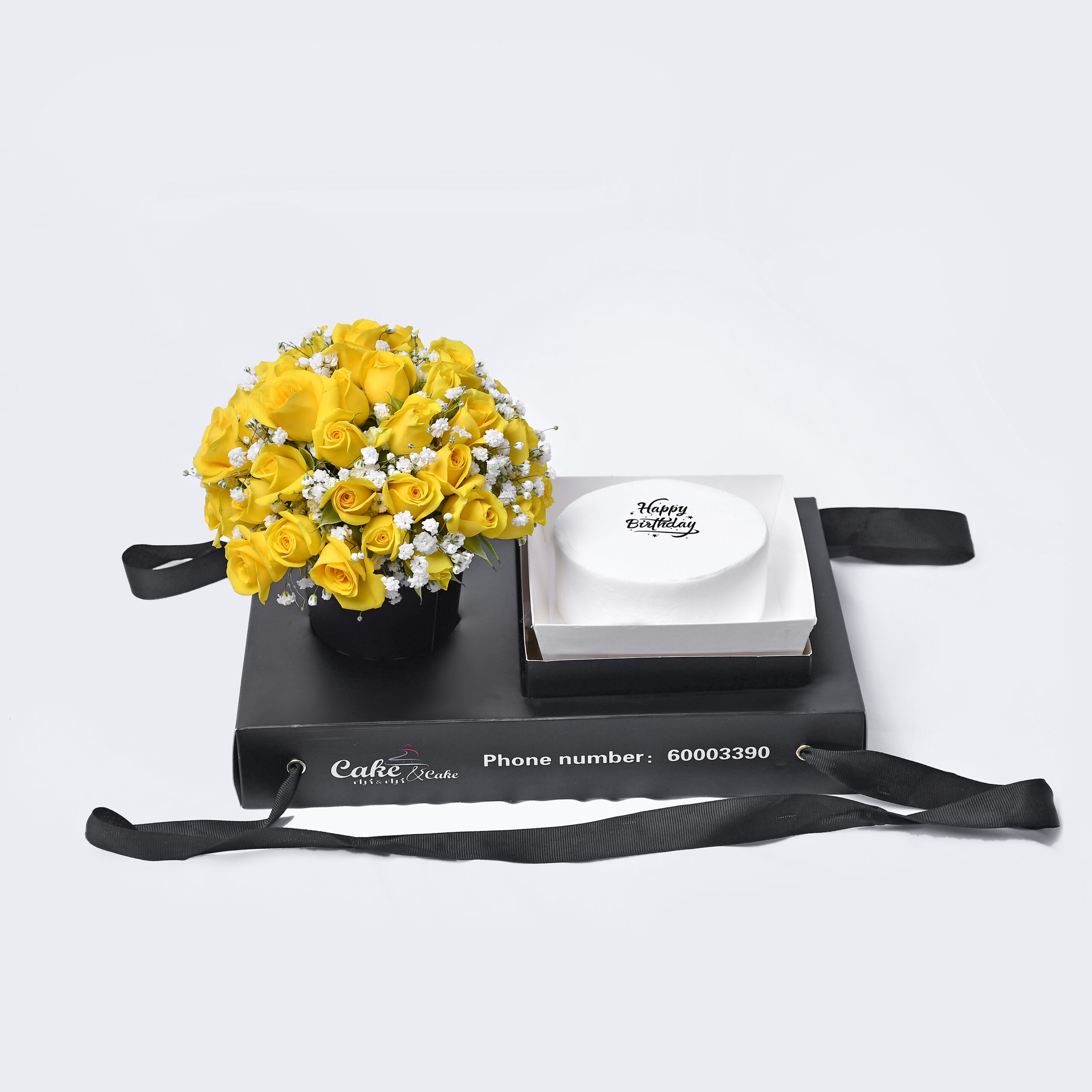 Celebrate in style with this elegant gift set! Featuring a beautifully arranged bouquet of vibrant yellow roses paired with a delicious cake in a sleek box, this combo is perfect for birthdays and special occasions. Presented on a premium black tray with easy-carry handles for a luxurious touch.