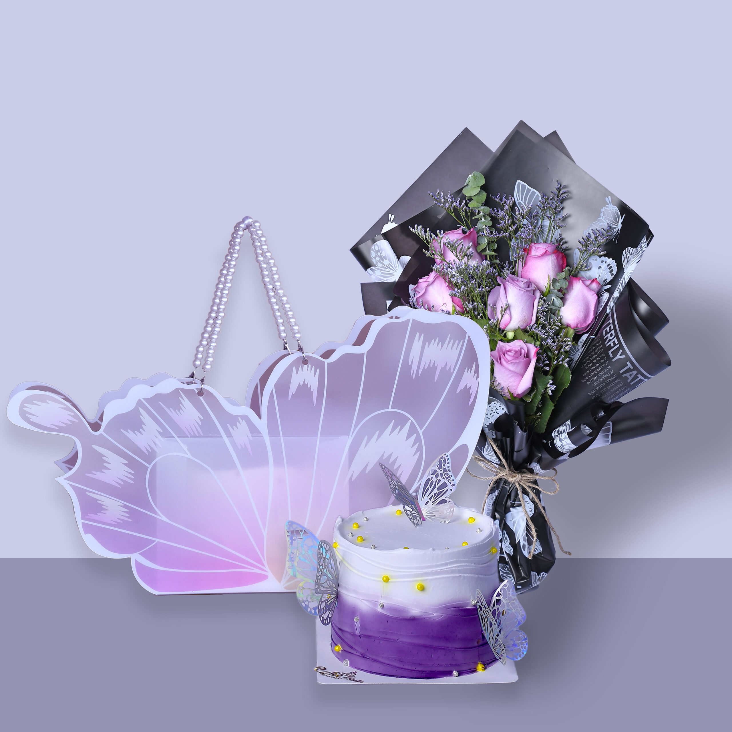 A coordinated celebration set featuring a pastel butterfly gift bag, a bouquet of pink roses wrapped in elegant butterfly-print paper, and a whimsical butterfly-topped cake—perfect for birthdays or magical moments.