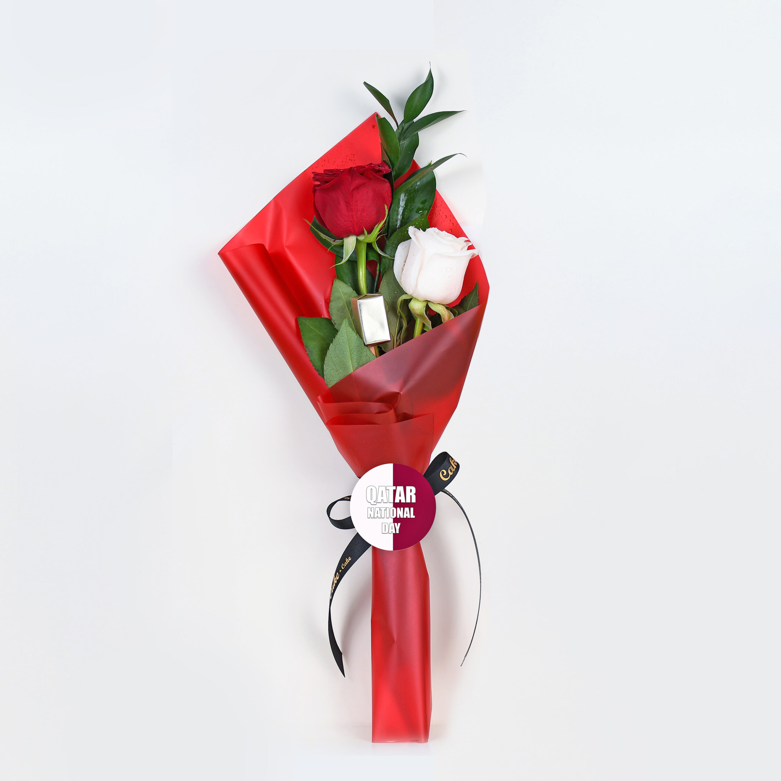 A bold bouquet of red and white roses, lush greenery, and a golden accent, wrapped in vibrant crimson and tied with a sleek black ribbon. A refined tribute to Qatar’s pride and unity.