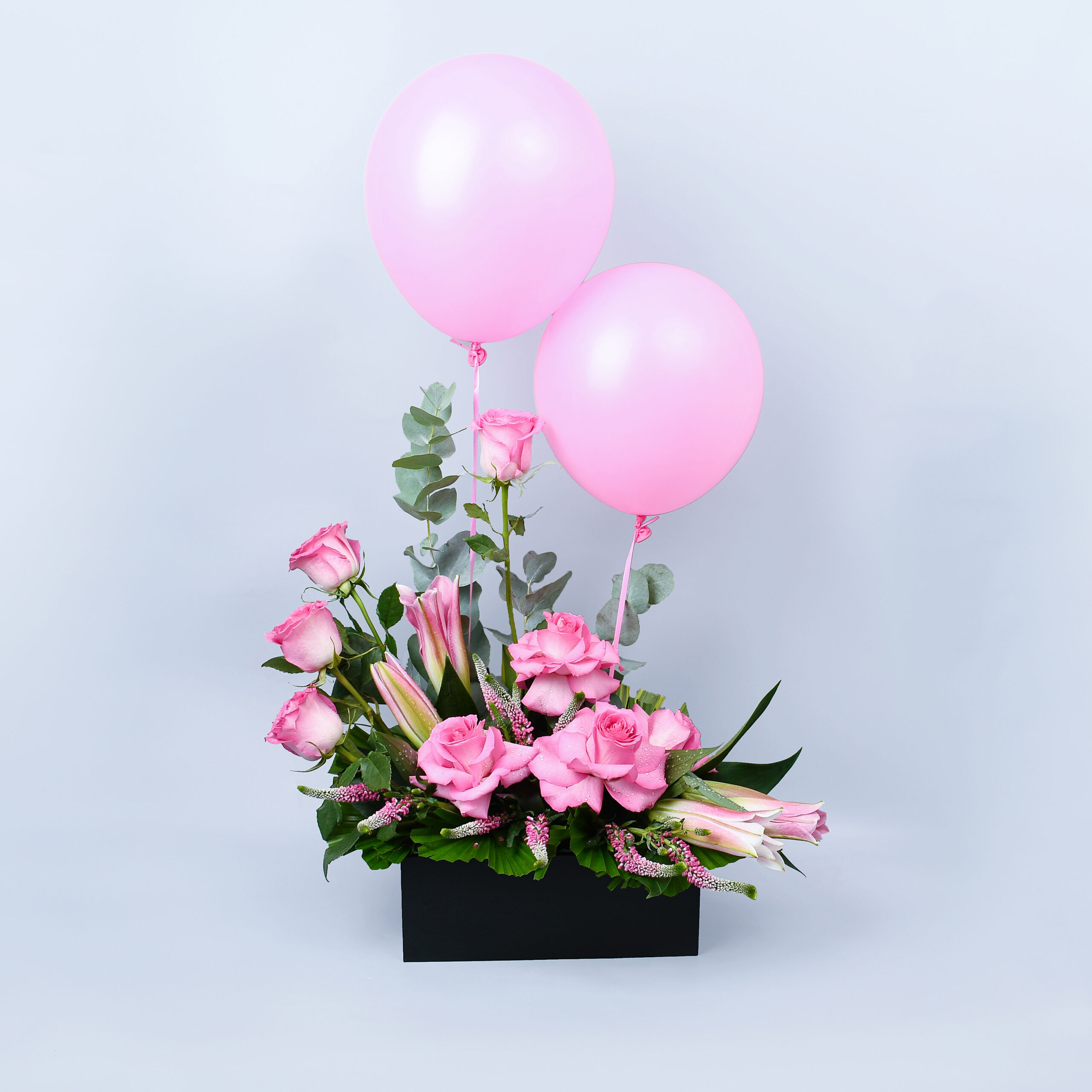 Celebrate the arrival of a precious baby girl with this sweet arrangement of soft pink roses, elegant white lilies, and delicate greenery. Presented in a white container and topped with cheerful pink balloons, it’s a graceful and heartfelt way to say “Welcome to the world.”