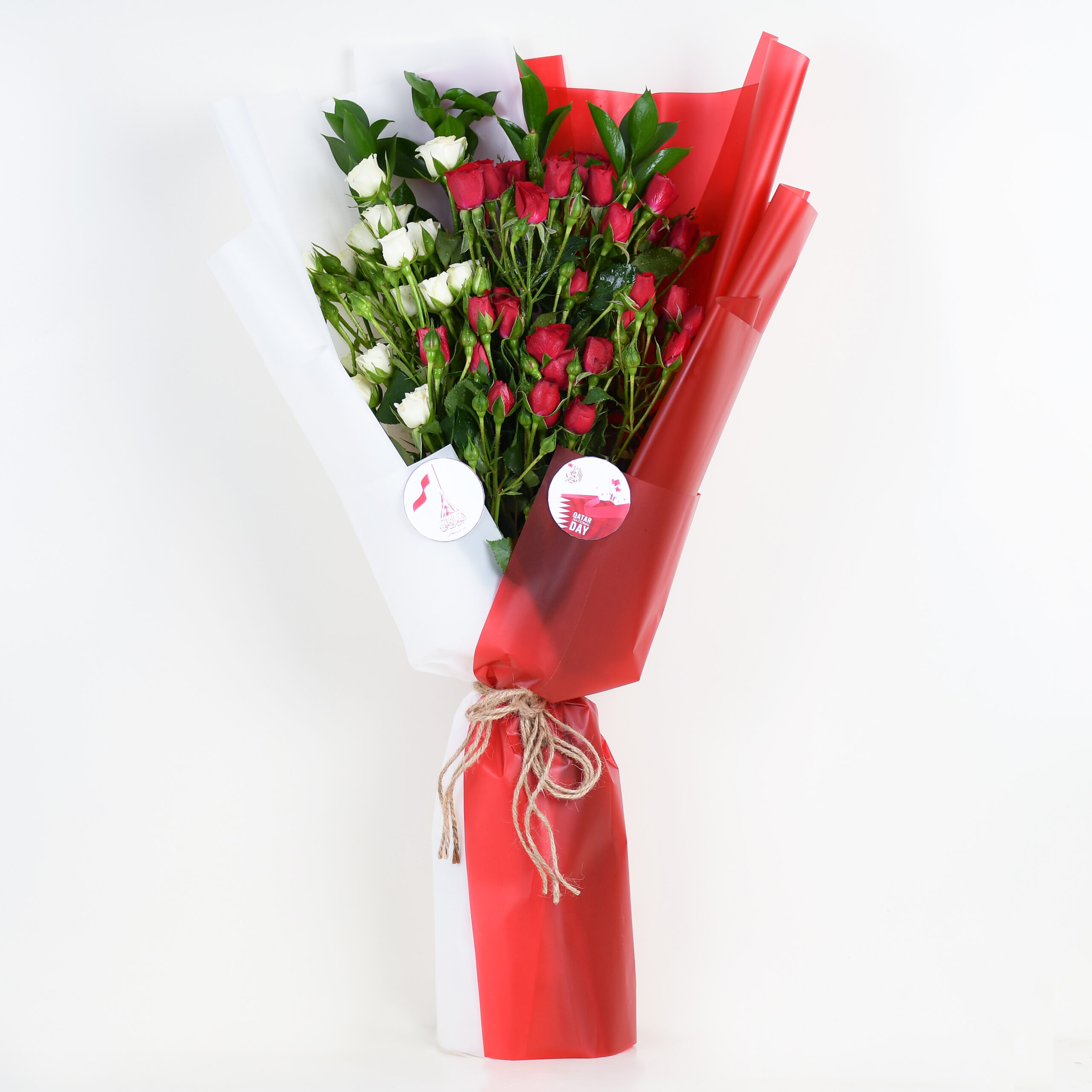 captivating blend of red carnations, white lilies, and lush greenery, wrapped in red and white paper, tied with a delicate string