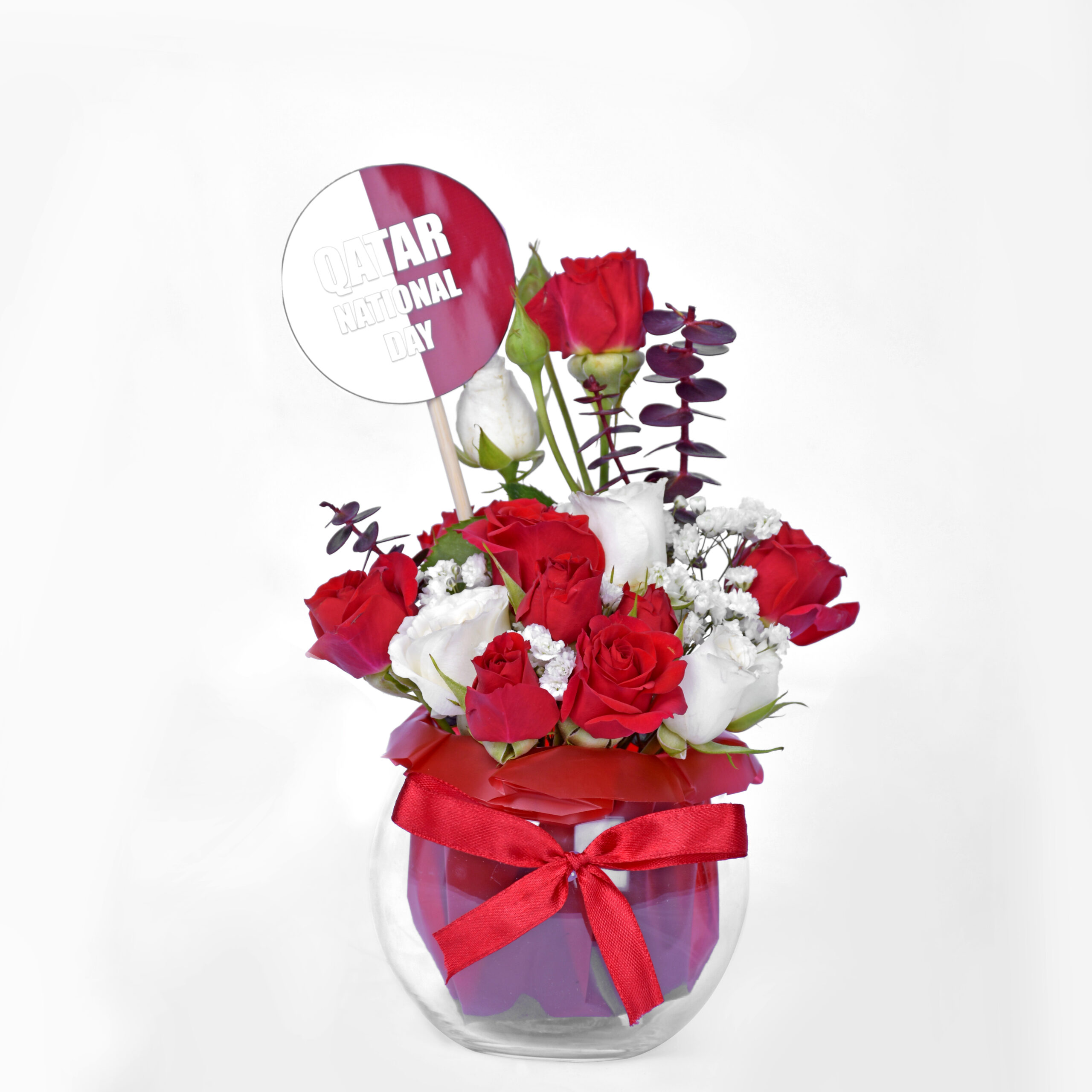 An ode to Qatar’s spirit, this floral creation pairs noble reds with pure whites and violet accents. Finished with a celebratory tag and ribbon, it’s a majestic centerpiece for any occasion.