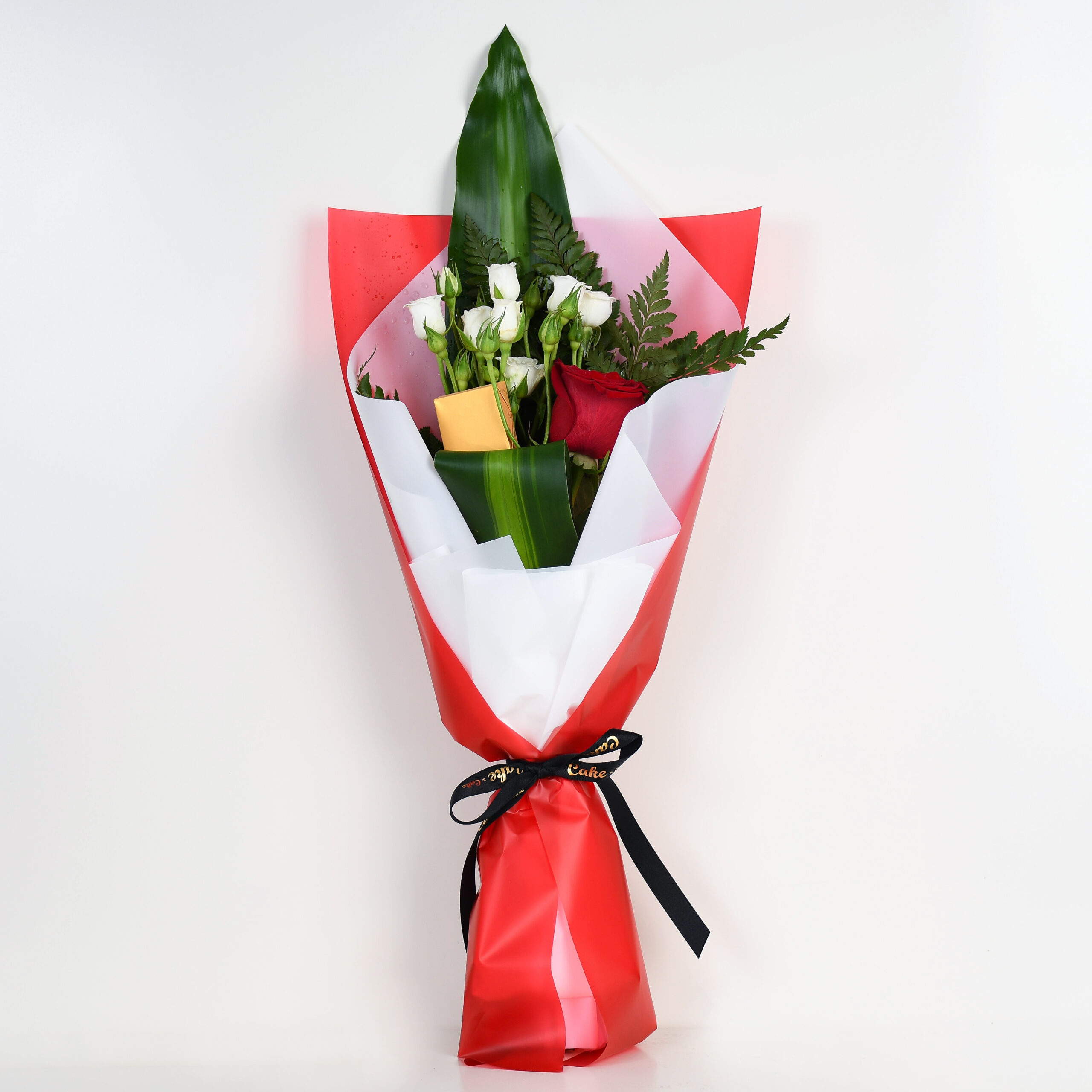 A bouquet that speaks of pride. White roses, a single red bloom, and lush greens wrapped in celebratory tones for Qatar National Day.