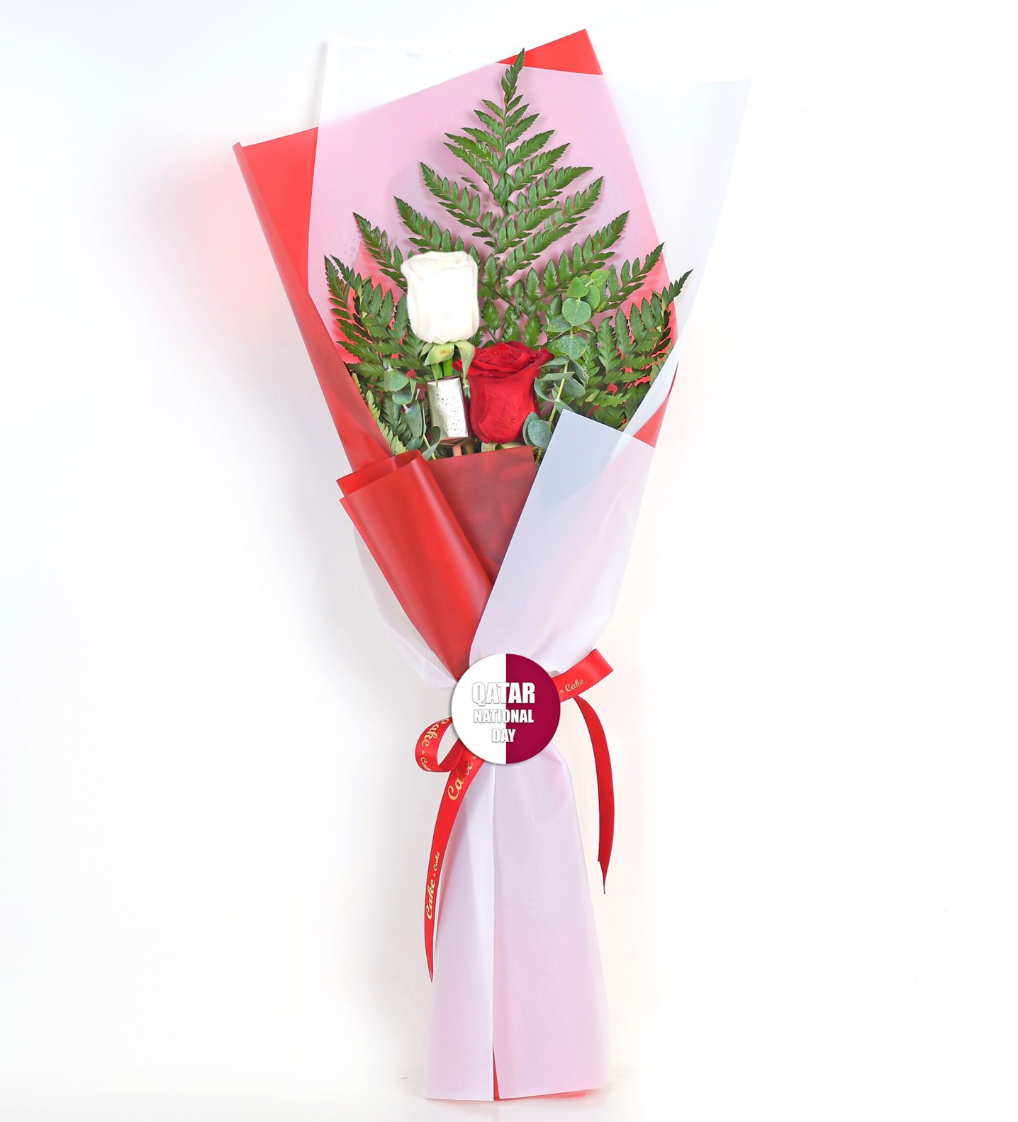 A bold yet elegant tribute to Qatar National Day, this bouquet features two rich red roses paired with a single white bloom, framed by lush green ferns. Wrapped in red and white paper and tied with a vibrant ribbon, it’s a striking symbol of unity and celebration.