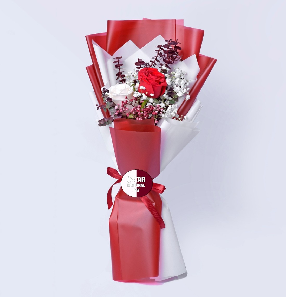 Celebrate Qatar National Day with this vibrant arrangement of red, white, and purple blooms—featuring a bold red rose at its heart, surrounded by white roses, baby’s breath, and delicate fillers. Wrapped in maroon and white paper and tied with a matching ribbon, this bouquet radiates national pride and festive elegance.