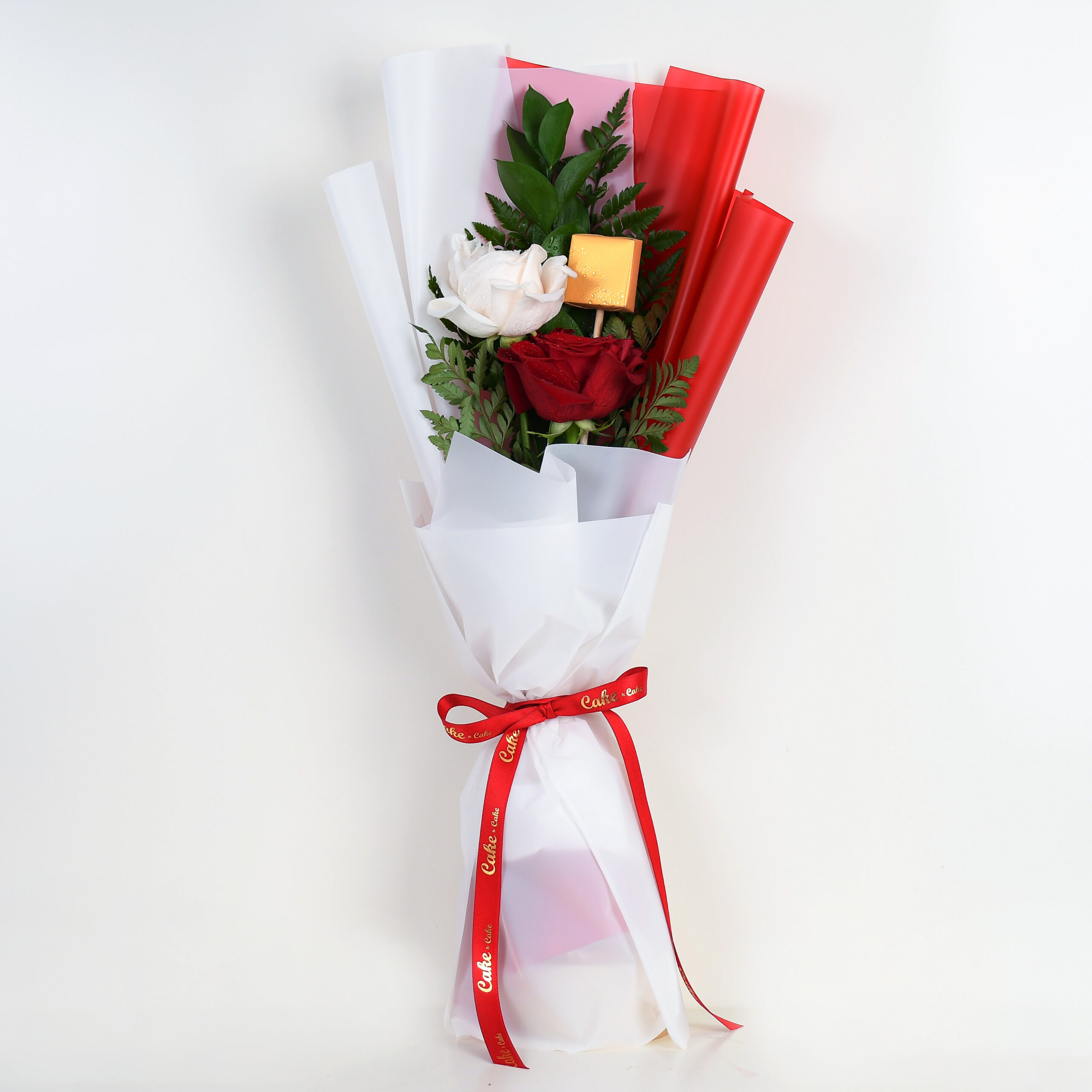 one red rose and one white bloom, symbolizing strength, peace, and pride. Wrapped in celebratory tones and tied with distinction.